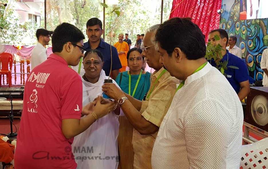 Amma gave away "Nalpamaram" trees to the AYUDHians on the occasion of Kannur Brahmastahanam festival as part of her Bharat yatra.