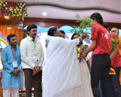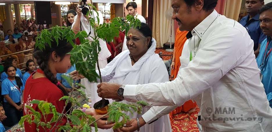 Inspired by Amma’s teachings, AYUDHians adopt 5 KMs of ‘Pavana’ river crossing the cities of Pimpri-Chinchwad and Pune and do the clean-up and maintenance starting from Boat Club Thergaon. The modules include clean up the river and river shore, install dust bins in the river premises, make compost out of the water moss, plant trees on the river shore, paint the walls in that area with awareness quotes about the nature, awareness campaigns in the societies & institutions on the river shore and maintain the whole area for one year. Amma blessed and launched the project on March 1st during Her Pune visit. Two AYUDH representatives received the symbolic ‘pitcher’ from the hands of Amma and three dignitaries- Mr Anil Shirole, Member of Parliament, Pune, Mr Mahesh Landge, MLA and Ms Shweta Shalini, Advisor to CM, Maharashtra. The dignitaries distributed native tree saplings to AYUDHians which will be planted on the shore of the river.