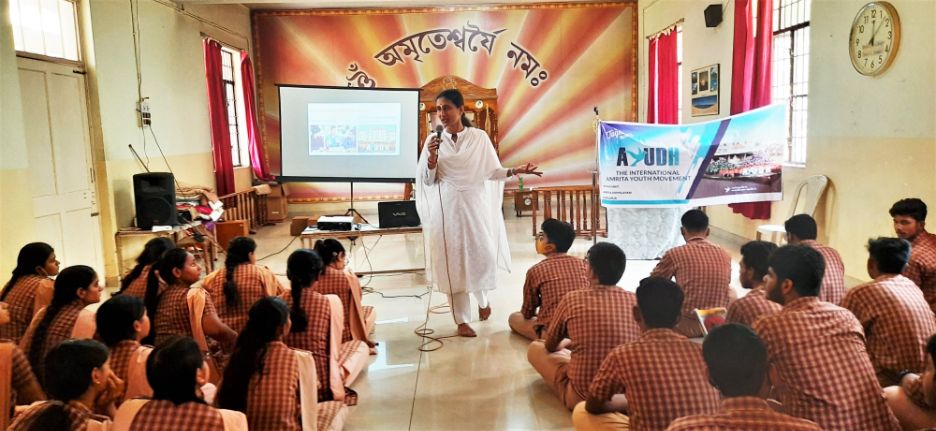 “The Self Management Workshop was a great learning experience. We got to know that, all the good practices that empower us to stay calm and focused in the challenging moments have their roots in Sanatana Dharma. It was a reminder for us to incorporate spiritual practices in our life along with Academics” remarked the participants from Amrita Vidyalayam, Durgapur, West Bengal who attended the Self-Management workshop conducted by the AYUDH coordinators from National Coordination Committee, Amritapuri. The workshop was done in 2 sessions. Brahmacharini Gunatitamrita Chaitanya, the Principal of Amrita Vidyalayam addressed the students and explained the benefits of being an AYUDHian even after their school life.