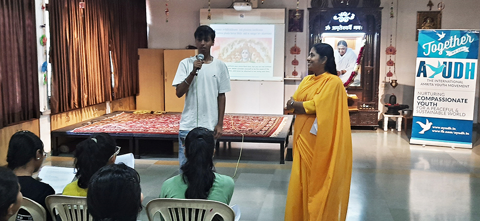 Bhagavad Gita shines as the beacon light of knowledge, inspiring millions to tread the path of Dharma. Life Management lessons as depicted by Gita was one of the most inspiring event in the AYUDH Self-Management Internship Program. Amma says “In the Gita, Lord Krishna teaches that spirituality is something we have to live in our day-to-day life – it is for everyone, and is especially applicable to all who want to live life full of happiness and contentment”