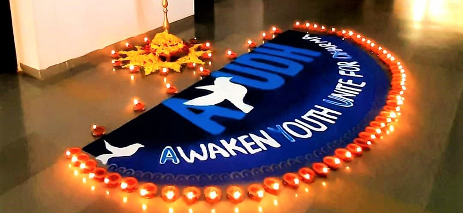 The Diyas were placed around the Rangoli made by AYUDHians. The AYUDH Moto ‘Awaken youth; Unite for Dharma’ made with Rangoli was a reminder for the youth to unite for Dharma always.